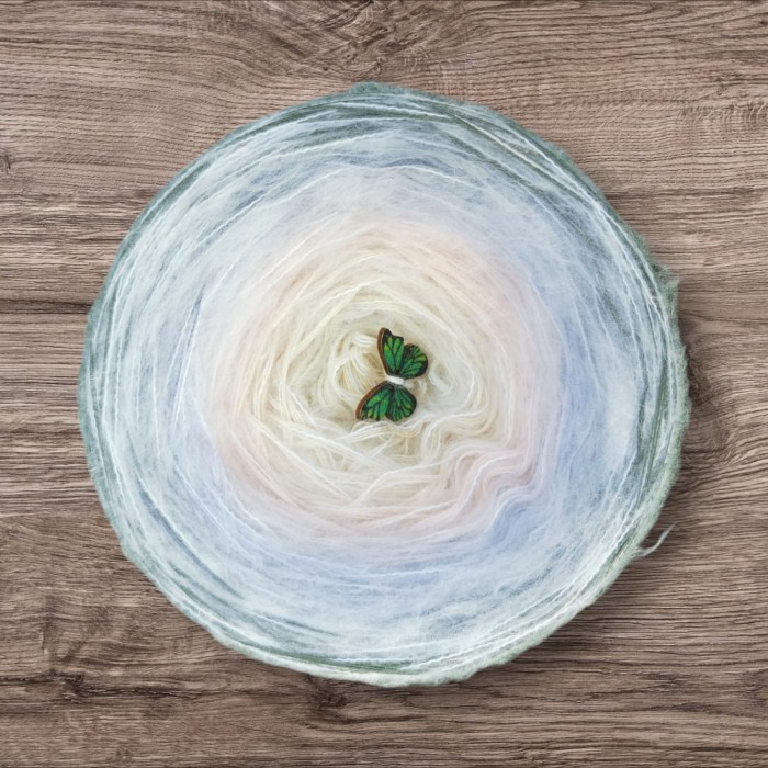 Motek ombre złożony odpowiednio z 3 nitek łączonych ze sobą kolor po kolorze z dodatkową nitka moheru w jednym kolorze przez całą długość motka. Niteczki nie są ze sobą skręcone a tylko lekko się zaplatają co nie utrudnia pracy na szydełku czy drutach.