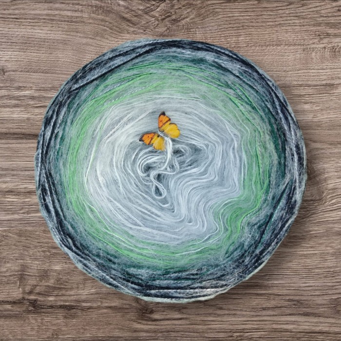 Motek ombre złożony odpowiednio z 3 nitek łączonych ze sobą kolor po kolorze z dodatkową nitka moheru w jednym kolorze przez całą długość motka. Niteczki nie są ze sobą skręcone a tylko lekko się zaplatają co nie utrudnia pracy na szydełku czy drutach.