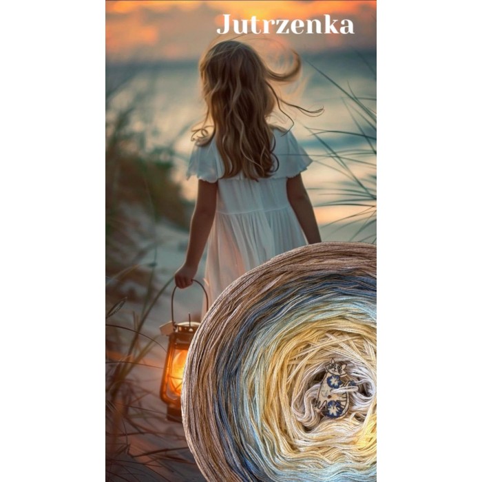 Motek ombre złożony odpowiednio z 3 nitek łączonych ze sobą kolor po kolorze plus jedna dodatkową w kolorze ciepłego beżu idącą przez całość długość motka. Jest to to nitka cieńsza i delikatnym połysku.